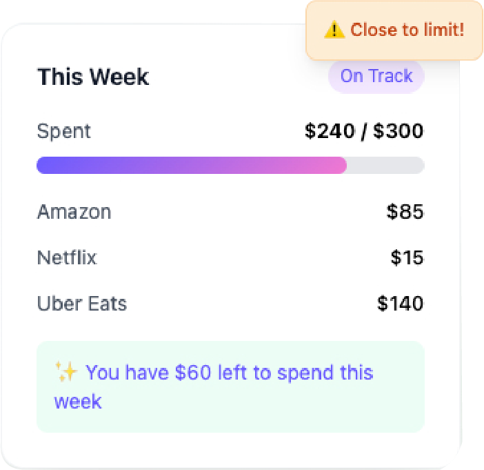 Get instant alerts when you approach your spending limits. Make informed decisions before completing purchases.